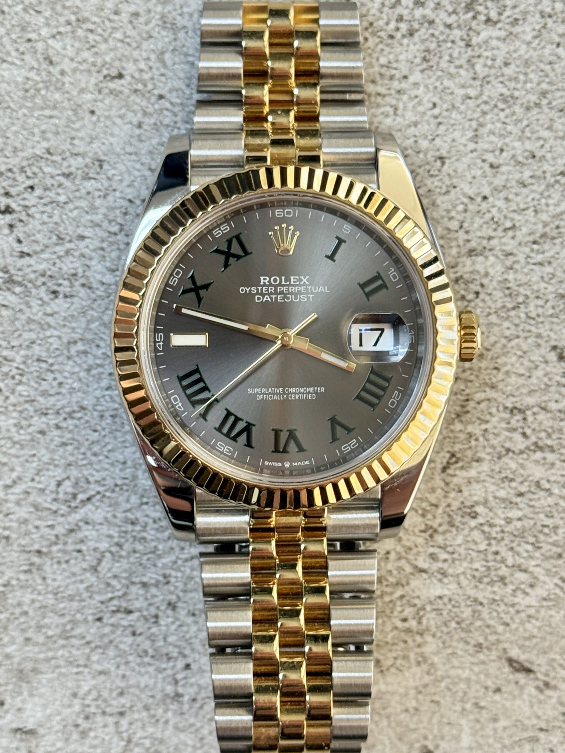 The striking dial of the Rolex Datejust 41 126333 features the iconic Wimbledon Jubilee design, with a sleek black background adorned with gold Roman numeral markers. The date function is prominently displayed at the 3 o’clock position with a Cyclops lens, enhancing legibility.